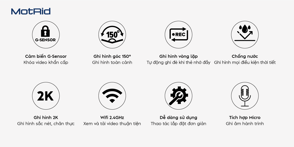 MotRid MD11 ghi hình với độ phân giải 2K, góc quay rộng lên tới 150° giúp ghi hình toàn cảnh sắc nét và chân thực. Ngoài ra, MD11 còn được trang bị tính năng ghi hình vòng lặp giúp ghi hình liên tục, cảm biến G-Sensor giúp khóa video khẩn cấp khi xảy ra va chạm và hỗ trợ kết nối với ứng dụng Viidure qua băng tần wifi 2.4GHz giúp xem lại, trích xuất video thuận tiện, nhanh chóng.
