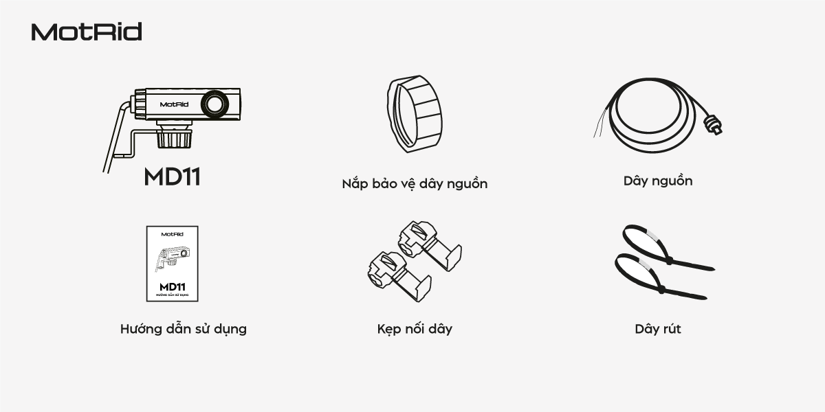Camera hành trình xe máy MD11 với thiết kế nhỏ gọn, được trang bị đầy đủ phụ kiện như kẹp nối dây, dây rút, dây nguồn, nắp bảo vệ dây nguồn và hướng dẫn sử dụng giúp cho người lái có thể dễ dàng lắp đặt.